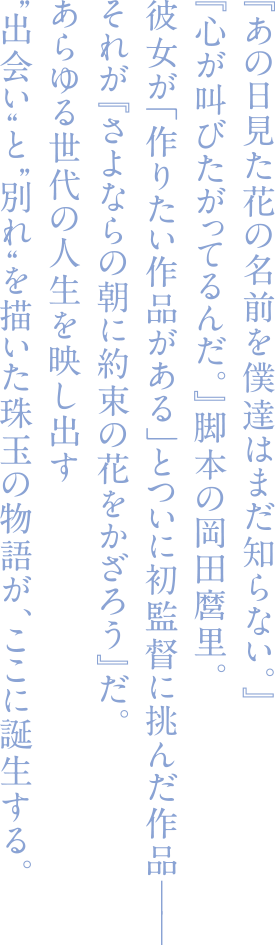 岡田監督を支えるスタッフには業界の実力派が結集した。制作は『true tears』『花咲くいろは』などで岡田とタッグを組んできたP.A.WORKS。キャラクター原案は岡田監督たっての希望で巨匠イラストデザイナー吉田明彦が担当。監督の片腕として作品を支える副監督を『凪のあすから』監督の篠原俊哉、キャラクターデザイン・総作画監督を同じく『凪のあすから』の石井百合子が務める。音楽は『GHOST IN THE SHELL / 攻殻機動隊』などの川井憲次。